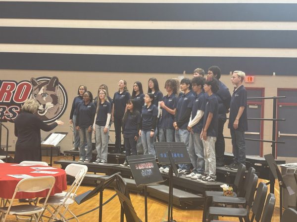 On November 1st, the Cougar Foundation gathered to induct 4 new members into the Sahuaro Hall of Fame: Chuck Stopani, Dan Gaul, Vicki Saxon, and Kendrick Wilson. Advanced Choir, Advanced Guitar, Culinary Club, and Student Council presidents were all present to welcome the new members and, of course, Sahuaro alumni. Student Council students were stationed at the front, greeting all the alumni; meanwhile, Advanced Guitar performed numerous songs from their repertoire while people were walking in. At last, Culinary Club was catering the breakfast. Culinary Club prepared hundreds of pancakes, sausages, bacon, eggs, omelettes, biscuits, fruit kebabs, and yogurt parfaits. To top it off, they had a coffee/tea station, orange juice, water, and pink lemonade for refreshments. After everyone was seated and eating, Advanced Choir led us in the National Anthem.