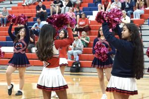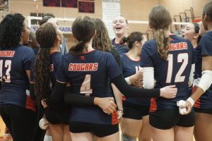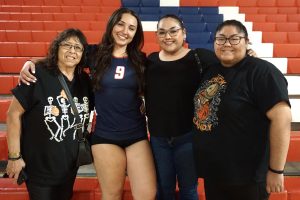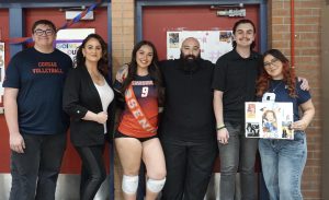 Abby, Olivia R., Lily, Neela, Aubrianna, and Coach Kiki supporting cheerleader and volleyball senior Dela