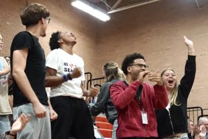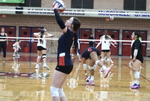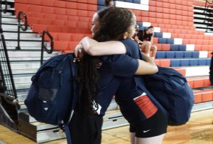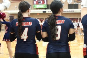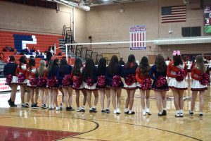 Sam, Dela, and the rest of volleyball stand for the National Anthem